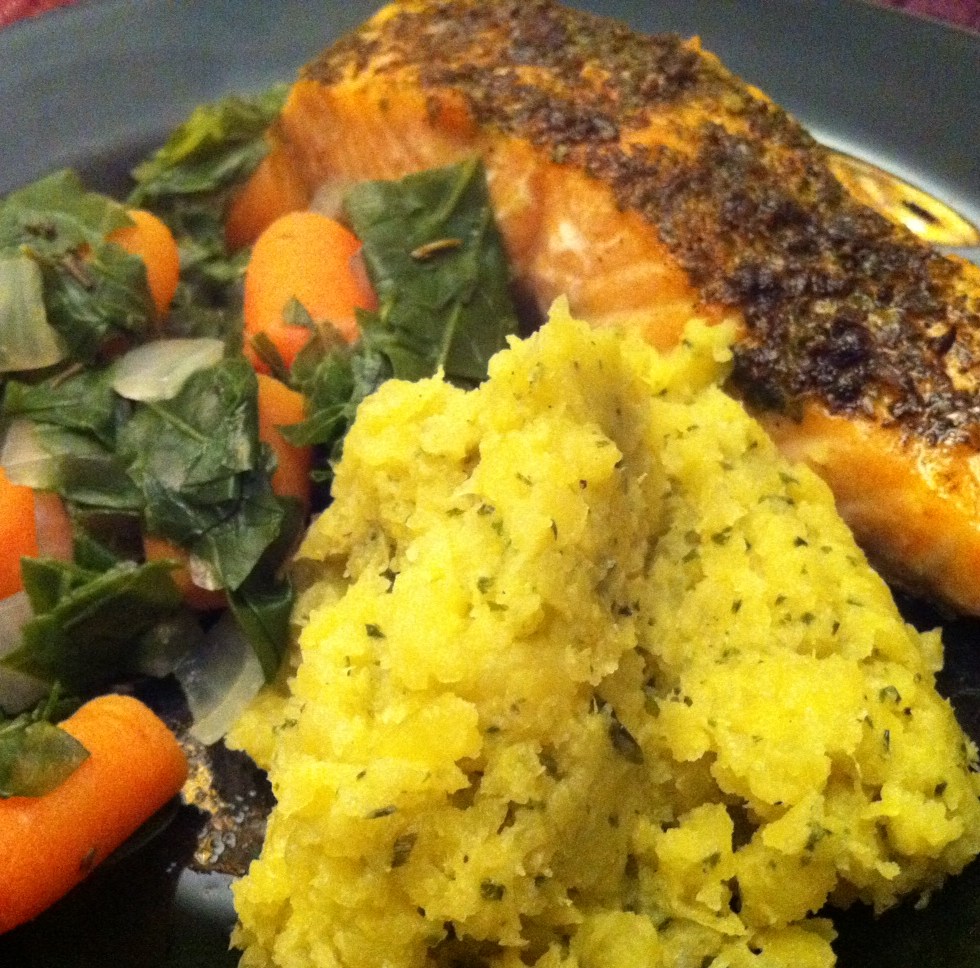 Grilled Salmon with Fresh Greens & Carrots and a side of Rutabaga Mash